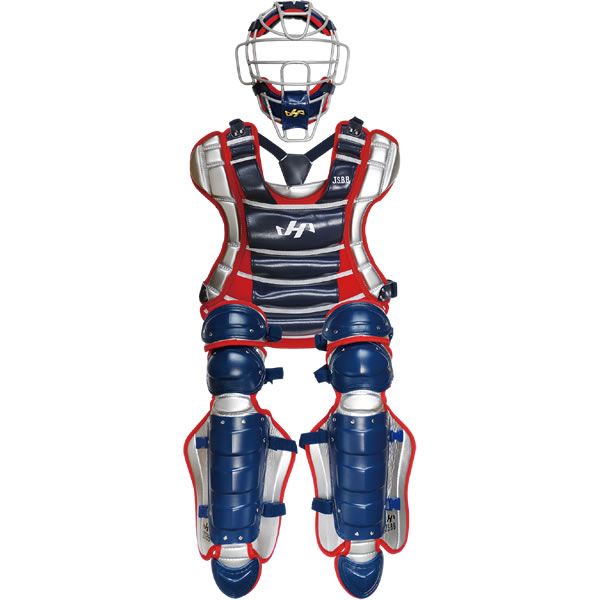ハタケヤマ(HATAKEYAMA) 少年軟式用 キャッチャー防具3点セット 品番:CG-JN22NS カラー:ネイビー×シルバー×レッド セット内容:マスク、プロテクター、レガース 付属品:専用袋 (財)全日本軟式野球連盟公認 SGマーク合格品 原産国:日本