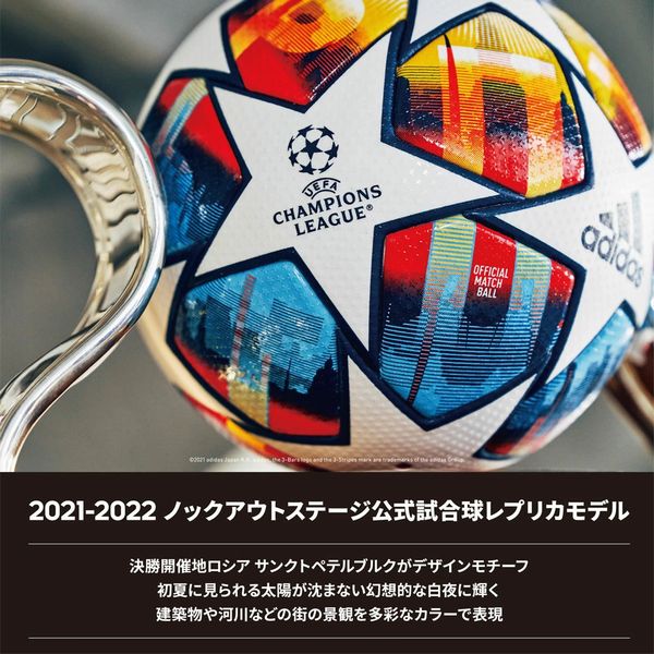 「UEFA チャンピオンズリーグ 21-22(UEFA Champions League 2021-2022)」ノックアウトステージ(決勝トーナメント)で使用される公式試合球のレプリカボール。 ロシア・サンクトペテルブルクをモチーフとした、白夜に輝く街並みからインスパイアされたデザインを採用。