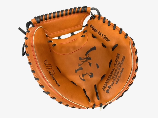 ハタケヤマ(HATAKEYAMA) 硬式野球用 キャッチャーミット 品番:PBW-M19br カラー:エコロジーブラウン 素材 表革:スペシャルジャパンハイド 裏革:スペシャルジャパンハイド ポジション:捕手用 左右:右投用 基本モデル:M19型 甲斐モデル シリコンラベル 専用グラブ袋 日本製