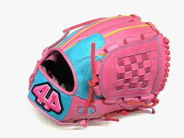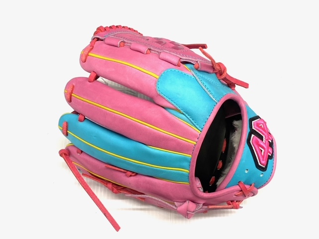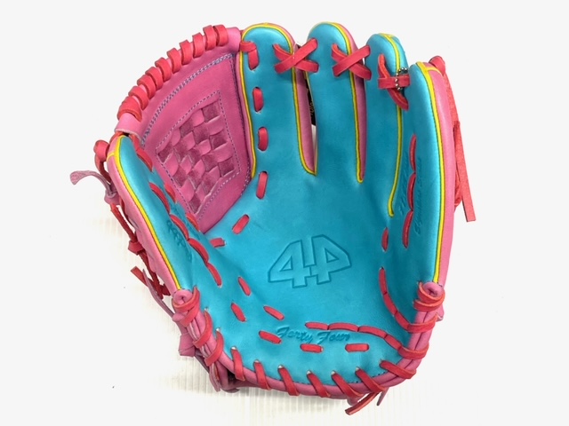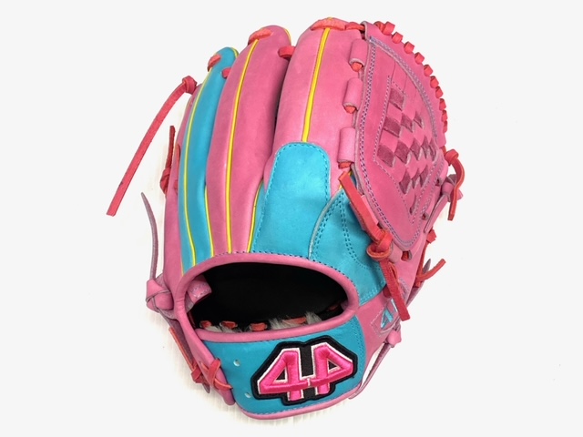 44(フォーティーフォー) 硬式軟式ソフトボール兼用グローブ 内野手用 品番:44-CR30 カラー:ピンク×スカイブルー 素材:USステアレザー 左右:右投用 ポジション:内野手用 サイズ:11.25インチ(約28.5cm) 特徴 グラブデザイン ポケットがしっかり設計できる型紙コンセプト。日米では捕球スタイルが異なるので、日本向けに開発された型を採用しています。 鉄板ポケットテクノロジー しっかりとしたポケットをサポートするために、硬めの芯を使用しています。指の動きと連動してグラブの操作性が向上!