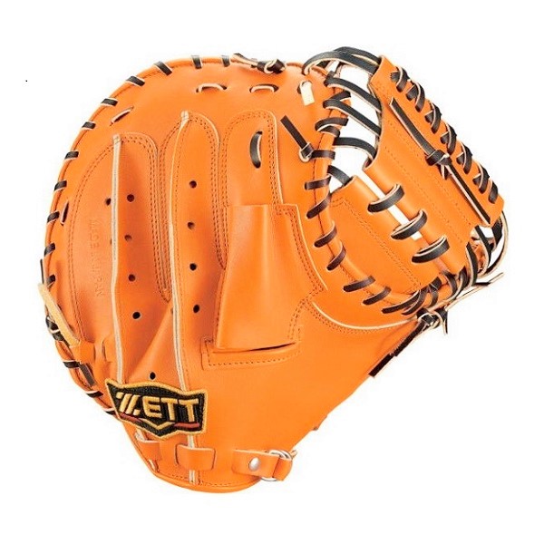 品番:BPROCM920 カラー:5637(オレンジ×ブラック) 素材:天然皮革製(表)国産牛レザー、(平裏)国産牛レザー ポジション:捕手用 左右:右投用 詳細:縦型、ポケット深め 付属品:専用グラブ袋付き 原産国:日本製