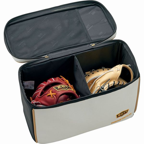 ゼット(ZETT) グラブケース2 品番:BAP1222B カラー:ホワイト/ブラック(1119) 素材:合成皮革(PVC)、ナイロン サイズ:長さ40×高さ26×巾18cm 容量:グラブ・ミット2ヶ入 仕様:天面裏メッシュポケット付き 原産国:中国
