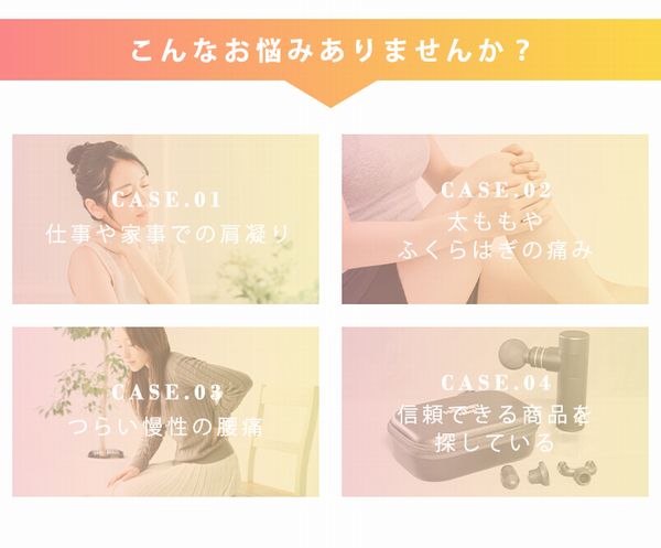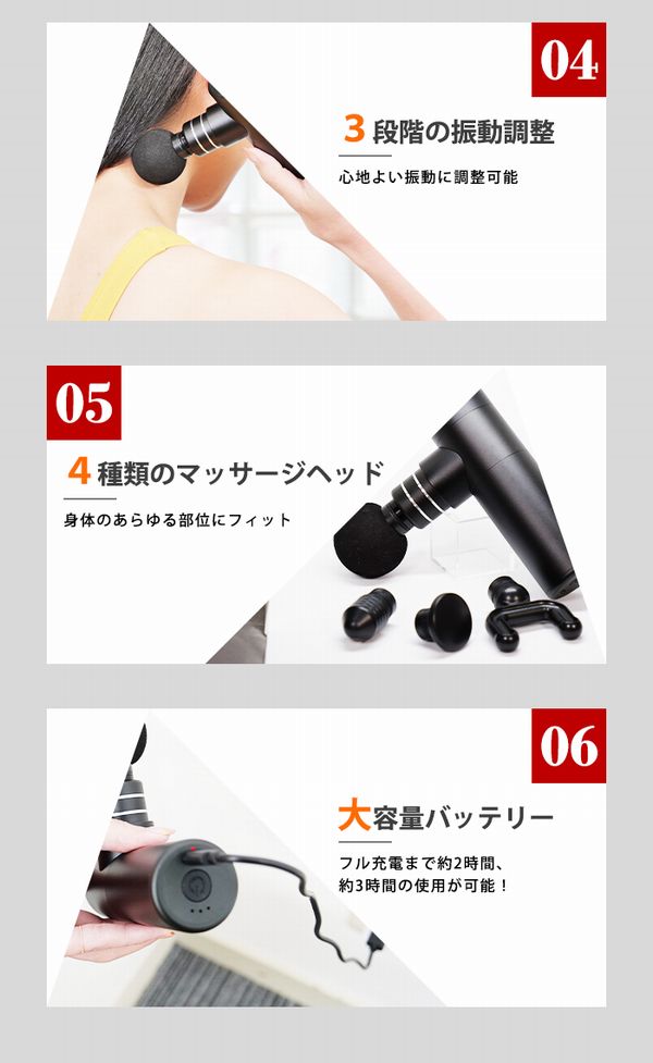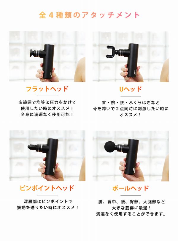 小型&軽量、かつパワフルな振動。 10店舗以上展開するプロトレーナー監修! 全4種のヘッドでピンポイントにマッサージ可能。 現役トレーナー監修