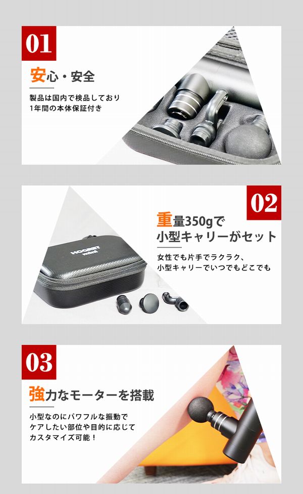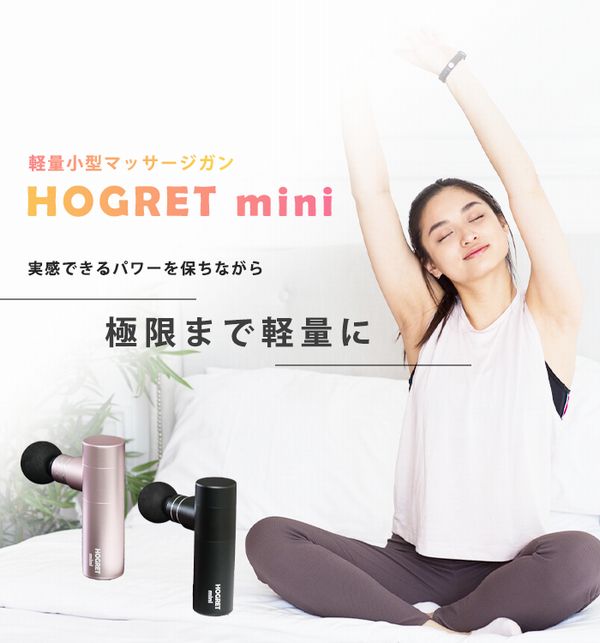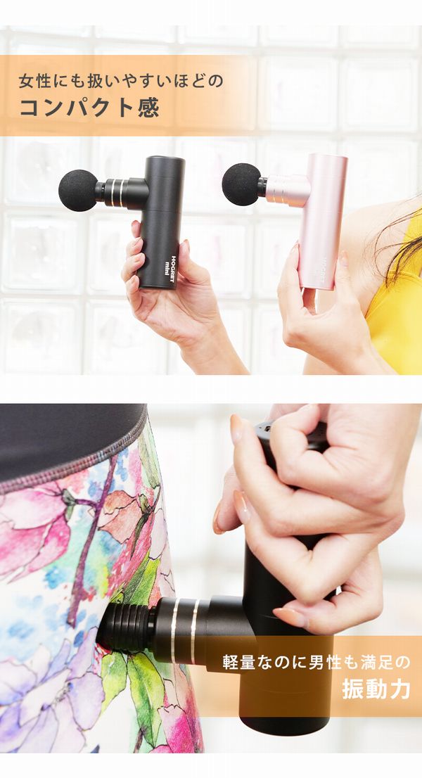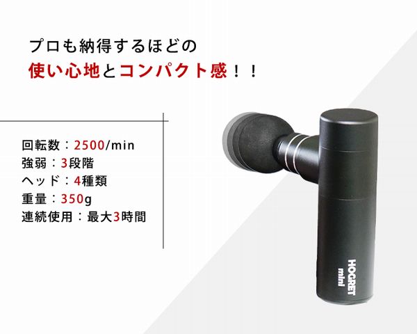 ホグレット ミニ(HOGRETmini) マッサージ機 マッサージガン カラー:ブラック サイズ:約130mm×85mm 重量:約350g 材質:本体表 アルミ 電池の種類:リチウムイオン電池(定格電圧:8V、定格電流:2A、本体入力:5V 2A) 最高回転数:2,500回/分、バッテリー充電時間:約2時間(充電環境により前後します。) 駆動時間:レベル3の連軸使用で約3時間(連続使用は安全のため10分で停止します。) 推奨使用環境温度:約10℃~35℃ 付属品:取扱説明書、本体、マッサージヘッド:4種、キャリーケース、USBケーブル(スマートフォンなどの充電器で充電が可能です。) 生産国:中国