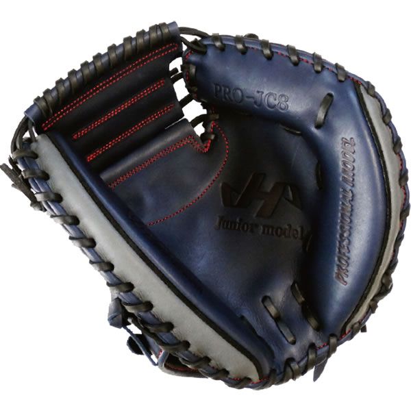 ハタケヤマ(HATAKEYAMA) 少年軟式用キャッチャーミット 品番:PRO-JC8 カラー:ネイビー×グレー(C) 素材 表革:北米ステアハイド 裏革:共牛革 左右:右投げ ポジション:捕手用 シェラームーブ 基本モデル:JL8型 台湾製