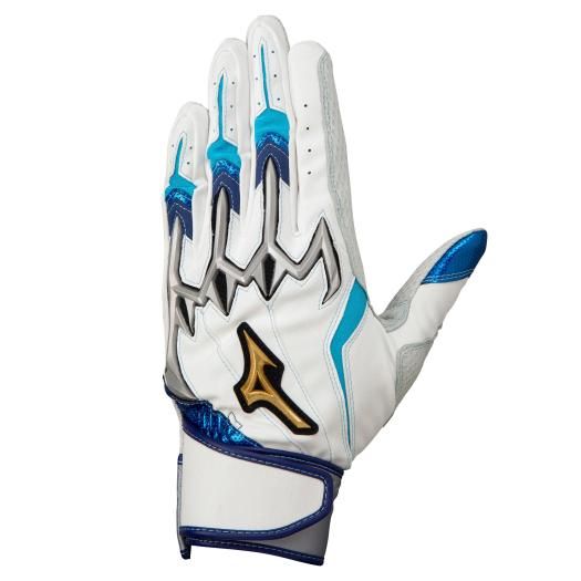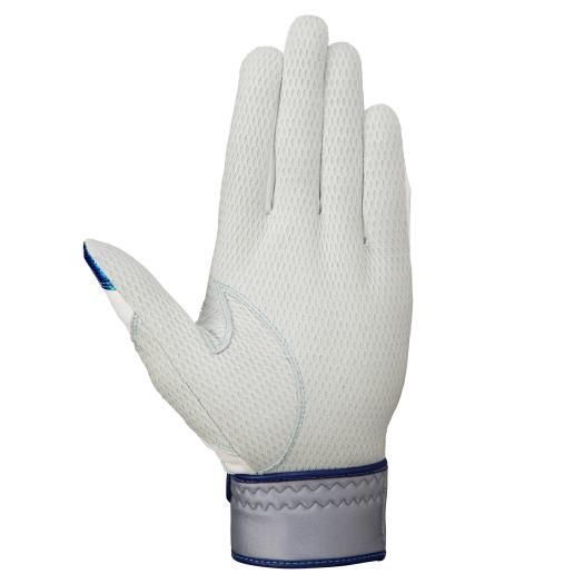 ミズノ(MIZUNO) ミズノプロ バッティング手袋 両手用 シリコンパワーアークL 品番:1EJEA09601 カラー:01:ホワイト×スカイブルー×シルバー(掌部カラー:ホワイト) サイズ:22~27cm 素材 掌部:羊革(型押し) 甲部:合成皮革、ポリエステル、ナイロン、ポリウレタン 機能・特徴 シリコンパワーアークライン グリップを握る際に最も重要な3本指にシリコーン樹脂パーツを配置し、握る際にテンションをかけることで、握り返す力を生み出します。さらにそのパーツを連結させることで、単独では発揮する力の弱い薬指・小指をサポートし、スイング時のパワーロスを最小限に抑えインパクトへ繋げます。