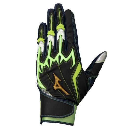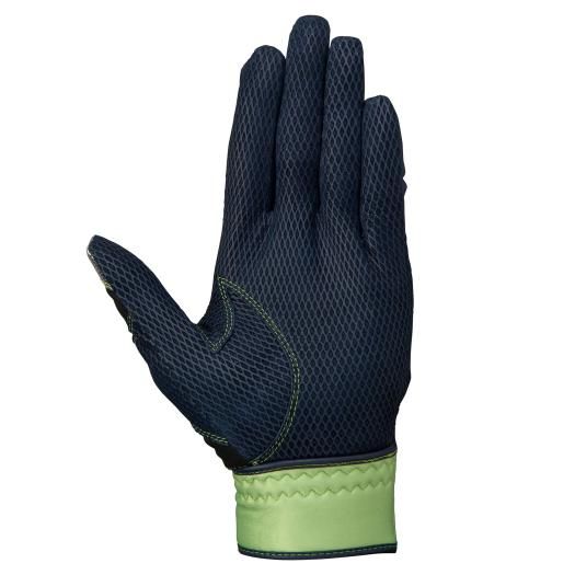 ミズノ(MIZUNO) ミズノプロ バッティング手袋 両手用 シリコンパワーアークL 品番:1EJEA09609 カラー:09:ブラック×ライム×ネイビー(掌部カラー:ネイビー) サイズ:22~27cm 素材 掌部:羊革(型押し) 甲部:合成皮革、ポリエステル、ナイロン、ポリウレタン 機能・特徴 シリコンパワーアークライン グリップを握る際に最も重要な3本指にシリコーン樹脂パーツを配置し、握る際にテンションをかけることで、握り返す力を生み出します。さらにそのパーツを連結させることで、単独では発揮する力の弱い薬指・小指をサポートし、スイング時のパワーロスを最小限に抑えインパクトへ繋げます。