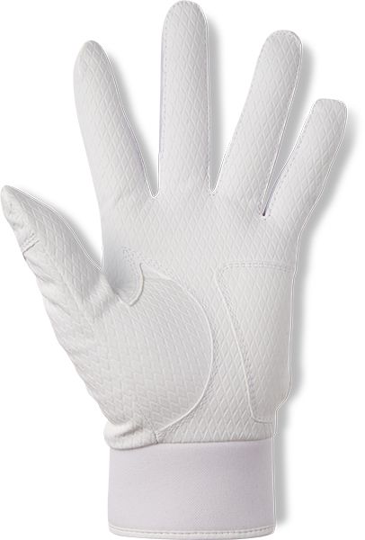 アンダーアーマー(UNDER ARMOUR) UA バッティンググローブ 両手用 クリーンアップ 品番:1371973 カラー:ホワイト(100) サイズ:SM(22-23cm)、MD(24-25cm)、LG(26-27)、XL(28-29cm) 素材 合成皮革、ポリエステル、ポリウレタン 立体成型:手の構造に沿ったカッティングが、グリップ時のフィット感を高める 原産国:インドネシア