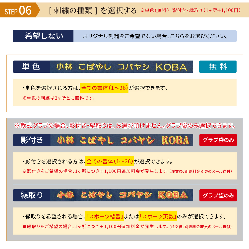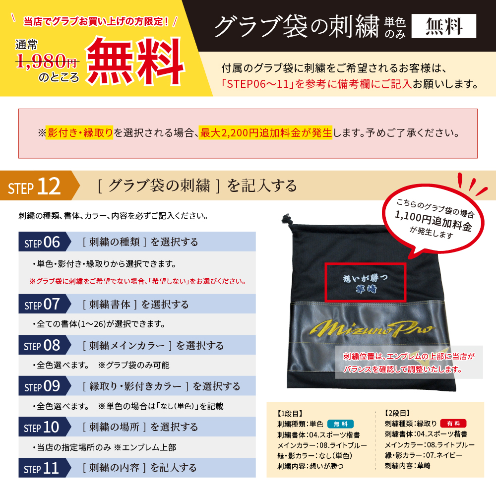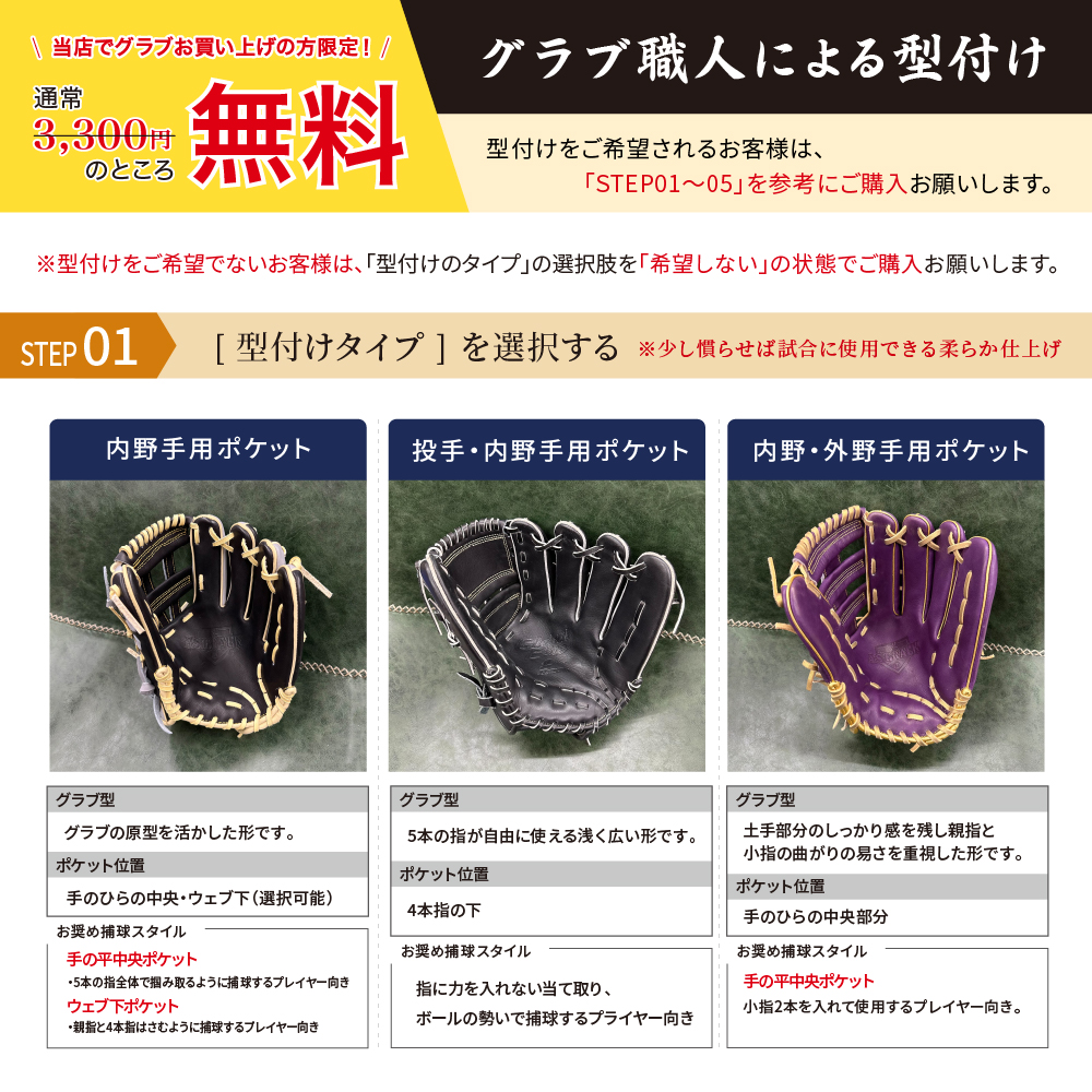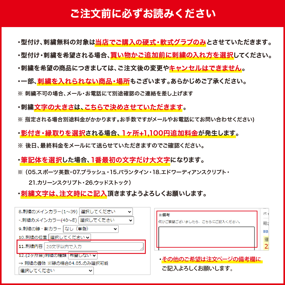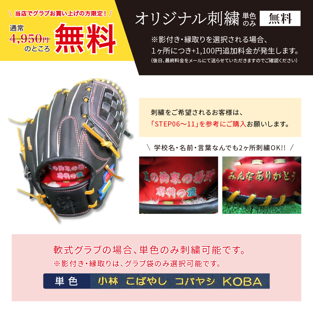 型付け、刺繍無料の対象は、当店で購入の軟式グラブのみとさせていただきます。