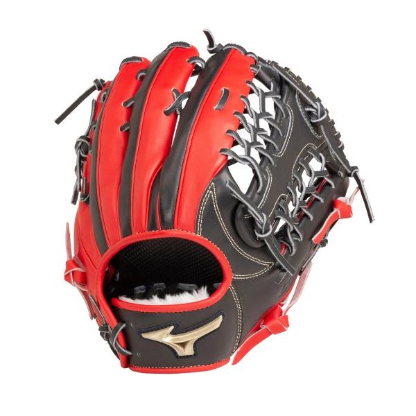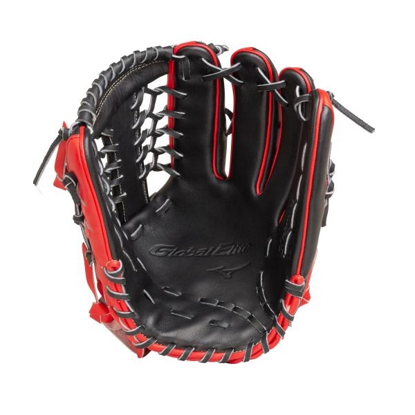 ミズノ(MIZUNO)ソフトボール用グラブ グローバルエリート HSelection02+ 限定モデル 品番:1AJGS26517 カラー:0970(ブラック×ラディッシュ) 素材:受球面・背面:マデレンダーレザーR(天然皮革:牛革) ポジション:外野手用(右投用) サイズ:16N 付属品:専用袋付(中国製) 詳細:指芯パーツ設計、パワーレイヤー構造(受球面裏・平裏・当て革への型押し)、Droll構造 原産国:フィリピン製