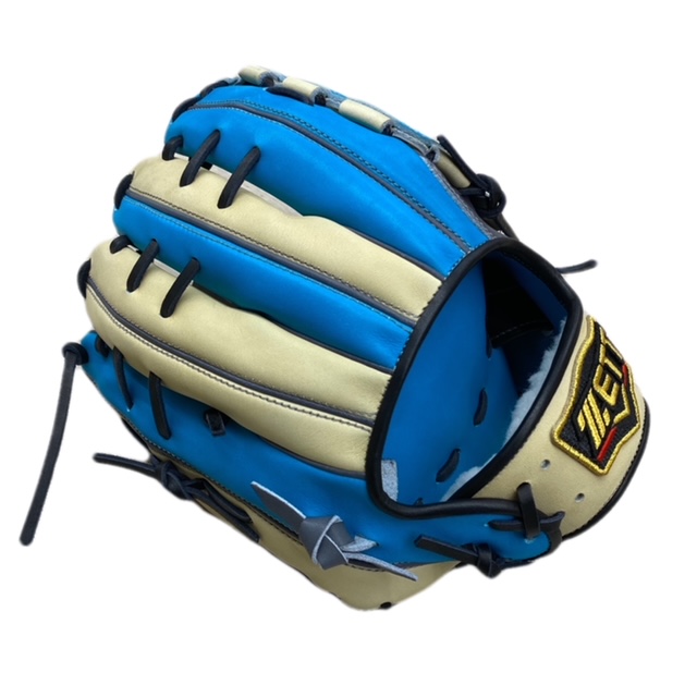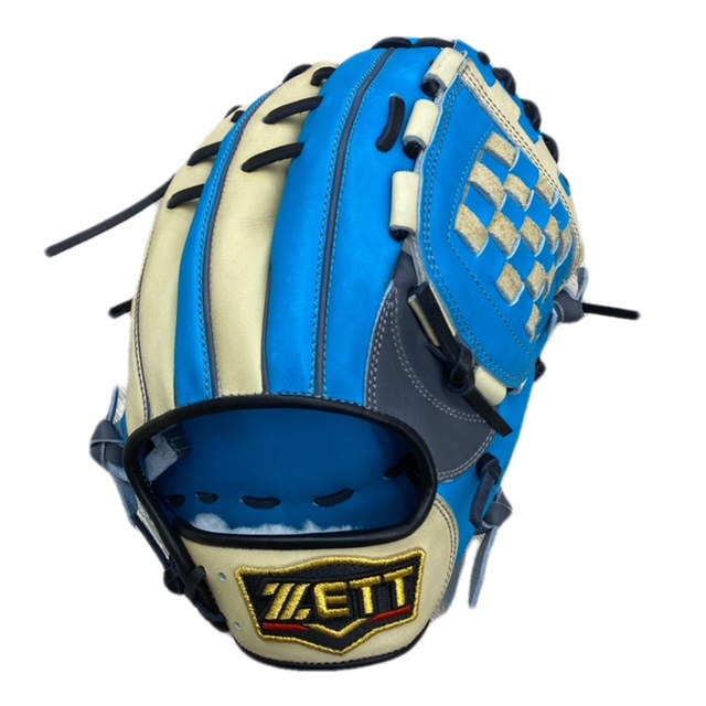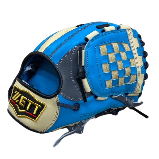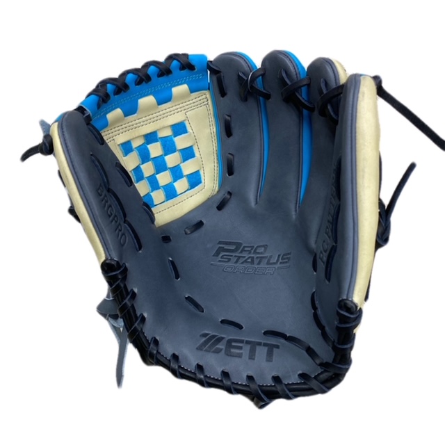 ゼット(ZETT) プロステイタス 軟式オーダーグラブ スポコバオリジナル 品番:BPGPRO カラー:サックス×パステルブラウン 素材:(表)ステアハイド、(平裏)本体同素材/ステア サイズ:4 ウェブ:ジョイントチェッカー ステッチカラー:ライトシルバー 革紐カラー:ブラック ハミダシ:玉ハミ/ダークグレー ヘリ革:ブラック ラベル:プロステイタス(金糸) バンド裏ムートン:ホワイト モデル:源田壮亮(西武ライオンズ)モデル 226型 ポジション:内野手用 左右:右投用 付属品:専用袋付き 原産国:ベトナム製
