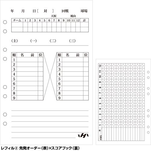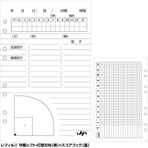 ハタケヤマ(HATAKEYAMA) 手帳・スコアブック レフィル4種(各10枚)付き 品番:SB-10 カラー:ブラック サイズ:幅18cm×高さ12cm×奥行3cm 素材:天然皮革(牛革) 付属品 レフィル4種(各10枚入) ・投手成績×スコアブック ・先発オーダー×スコアブック ・守備シフト・打球方向×スコアブック ・両面罫線