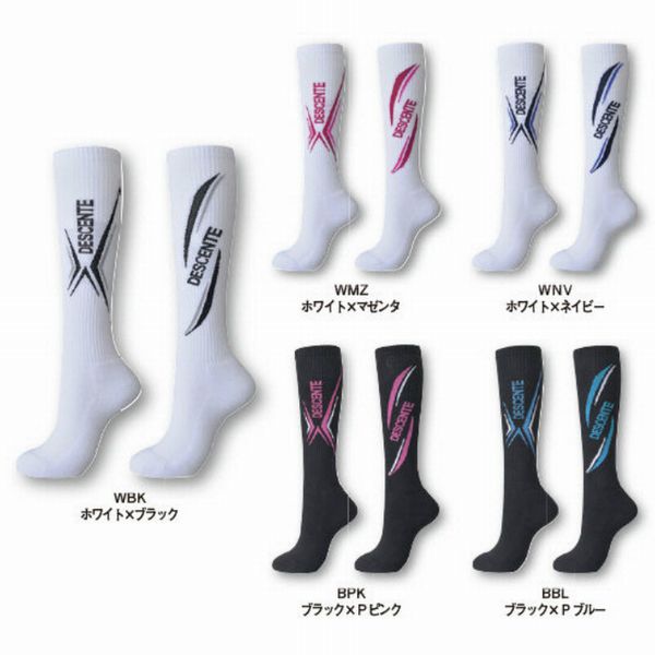 デサント(DESCENTE) バレーソックス2足組ハイソックス 品番:DVB-9744S2 カラー ホワイト×ブラック(WBK) ホワイト×マゼンタ(WMZ) ホワイト×ネイビー(WNV) ブラック×Pピンク(BPK) ブラック×Pブルー(BBL) サイズ:20〜23cm、23〜25cm 素材:綿・アクリル・ポリエステル・ポリウレタン