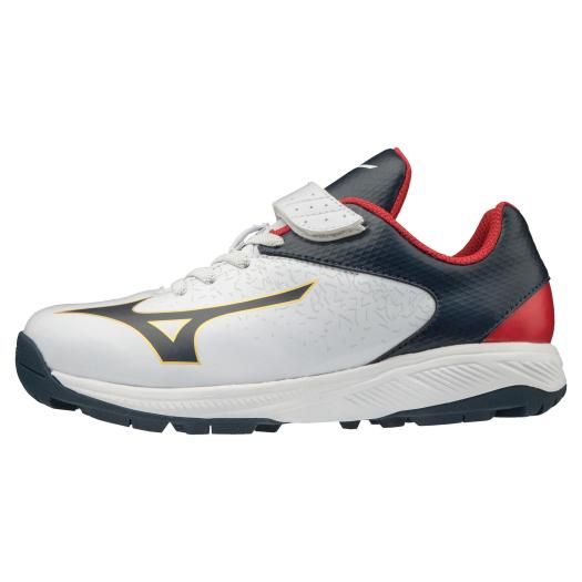 ミズノ(MIZUNO) ジュニア トレーニングシューズ セレクトナイントレーナー2 CR 品番:11GT192442 カラー:42:ホワイト×ネイビー×ゴールド サイズ:18.0、19.0、20.0、21.0~23.0cm 素材 甲材:人工皮革 底材:合成底 質量:約195g(21.0cm片方) インソール:インソール取り外し不可 シューズ幅:3E相当の方向け 原産国:インドネシア製
