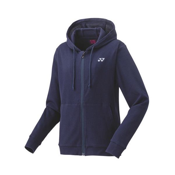 ヨネックス(YONEX) ウィメンズ ニットウォームアップパーカー 品番:57070 カラー:019(ネイビーブルー) サイズ: S・M・L・O・XO 素材:ポリエステル64%、綿34%、ポリウレタン2% 機能:ストレッチ、制電、再生ポリエステル 原産国:中国