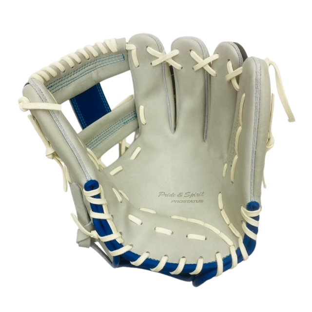 ゼット(ZETT) プロステイタス 軟式限定グラブ 遊撃手・二塁手モデル 品番:BRGB32360 カラー:1525(グレー/Rブルー) 素材:天然皮革製、(表)ステアレザー、(平裏)ステアレザー ポジション:遊戯手・二塁手用(右投げ用) サイズ:4 付属品:専用袋付き 原産国:ベトナム製