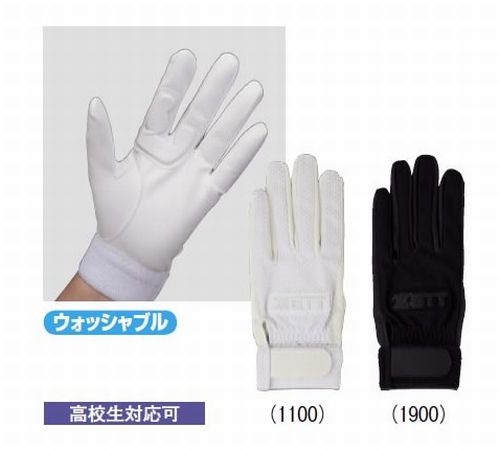 ゼット 守備用手袋 片手用 高校生対応可 カラー:ホワイト(1100)、ブラック(1900) サイズ:右手用/RHS(22〜23cm)、RHM(24〜25cm)、RHL(26〜27cm) 左手用/LHS(22〜23cm)、LHM(24〜25cm)、LHL(26〜27cm) 素材:甲側/合成皮革(フィールドセンサー)×平側/合成皮革(抗菌・防臭加工) 片手用 ウォッシャブル