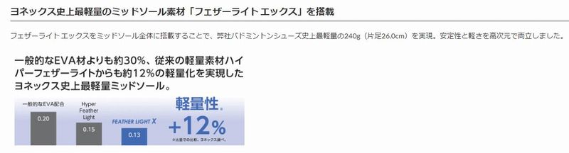 ヨネックス史上最軽量。 軽量性・グリップ性が向上し、より素早いフットワークを生む。