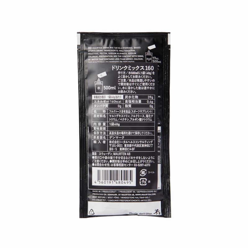 モルテン(MAURTEN) エネルギードリンク DRINK MIX 160(1袋) 含有成分:マルトデキストリン、フルクトース、ペクチン、アルギン酸ナトリウム、塩化ナトリウム 内容量:40g 栄養成分表示【1袋(40g)あたり】 エネルギー:160kcal タンパク質:0g 脂質:0g 炭水化物:39g 食塩相当量:0.4g お召し上がり方 スポーツの前、最中、直後などお好きなタイミングでご利用ください。 保存方法 直射日光・高温多湿を避け、冷暗所で保管して下さい。