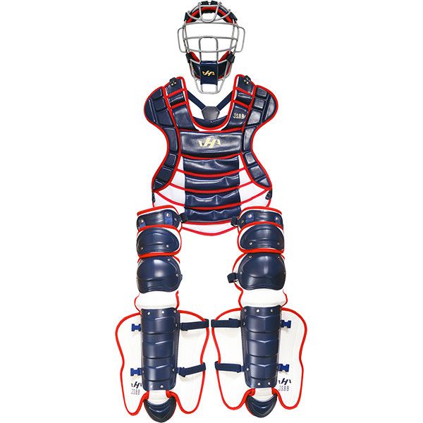 ハタケヤマ(HATAKEYAMA) 一般軟式用 キャッチャー防具3点セット 品番:CG-N23ND カラー:ネイビー×ホワイト×レッド セット内容:マスク、プロテクター、レガース 付属品:専用袋 (財)全日本軟式野球連盟公認 SGマーク合格品 原産国:日本