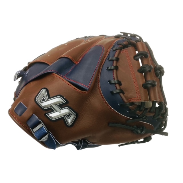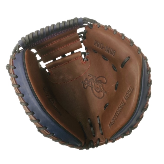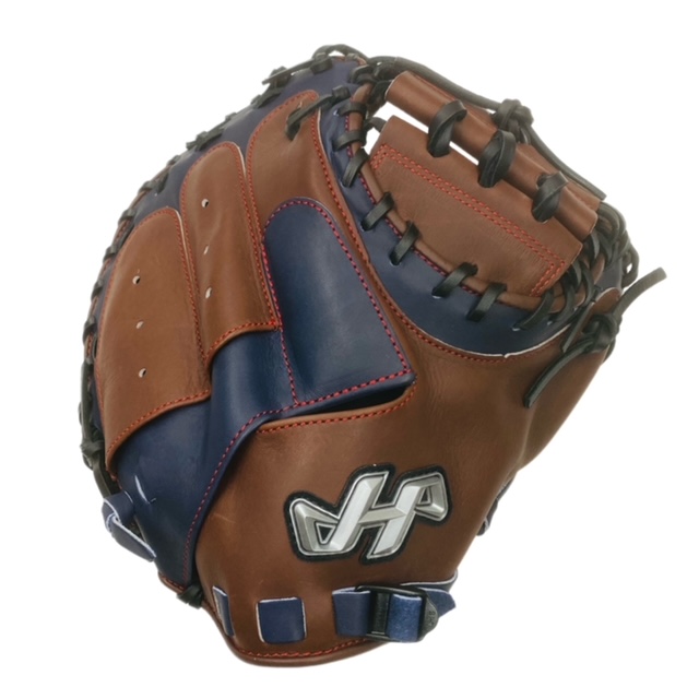 ハタケヤマ(HATAKEYAMA) 軟式野球 キャッチャーミット シェラームーブモデル 品番:PRO-M08-A カラー:エコロジーブラウン×ネイビー 素材:表革:北米ステアハイド、裏革:共革 モデル:M8型(伊藤モデル) ポジション:捕手用 左右・右投用 機能・特徴 シェラームーブ 座ブトンスポンジ