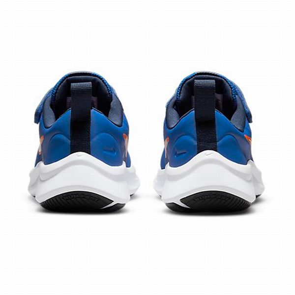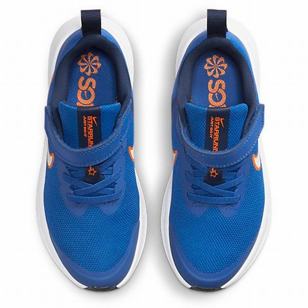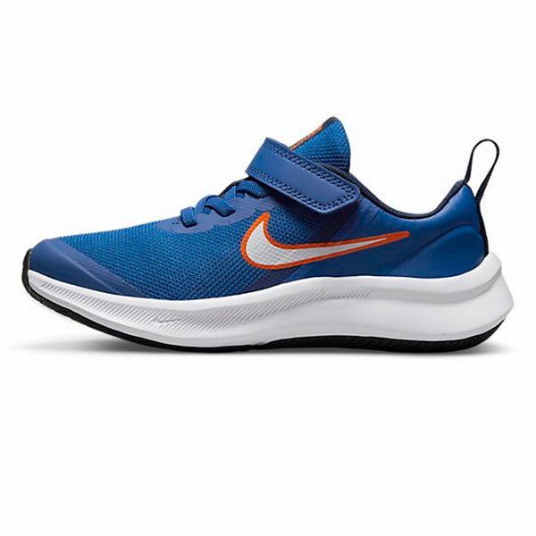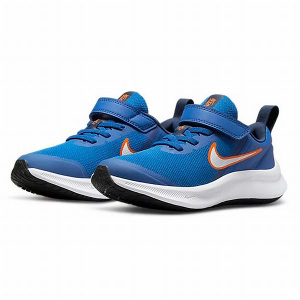 ナイキ(NIKE) ジュニア ランニングシューズ スターランナー3 品番:DA2777 カラー:ゲールロイヤル/ホワイト/ミッドナイトネイビー/セイフティオレンジ(403) サイズ:18.0~22.0cm 素材 アッパー:合成繊維+合成皮革+合成樹脂 アウトソール:ゴム底 機能・特徴 ランに対応。 ストラップでサポート。 星形のスタッドでトラクションを強化。 柔らかくて心地良い足裏のフォームクッショニングとインソール。 つま先を引きずる子どものために、つま先部分にオーバーレイを配して耐久性を強化。 足首周りのウォーターフォール形状と増量されたパッドが、滑らかで快適な履き心地を提供。