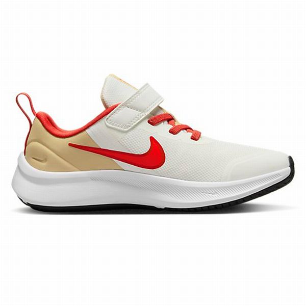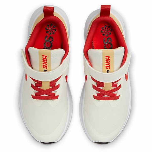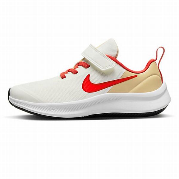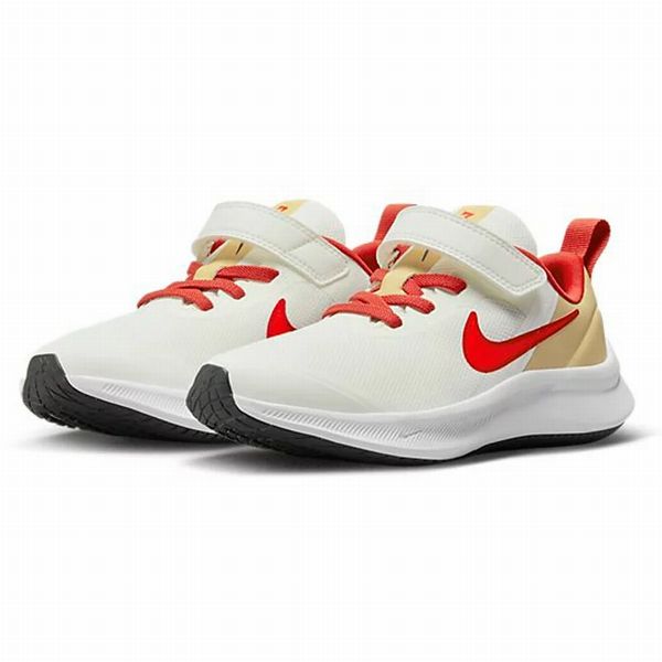 ナイキ(NIKE) ジュニア ランニングシューズ スターランナー3 品番:DA2777 カラー:セイル/ブライトクリムゾン/セサミ/レッドクレイ(101) サイズ:18.0~22.0cm 素材 アッパー:合成繊維+合成皮革+合成樹脂 アウトソール:ゴム底 機能・特徴 ランに対応。 ストラップでサポート。 星形のスタッドでトラクションを強化。 柔らかくて心地良い足裏のフォームクッショニングとインソール。 つま先を引きずる子どものために、つま先部分にオーバーレイを配して耐久性を強化。 足首周りのウォーターフォール形状と増量されたパッドが、滑らかで快適な履き心地を提供。