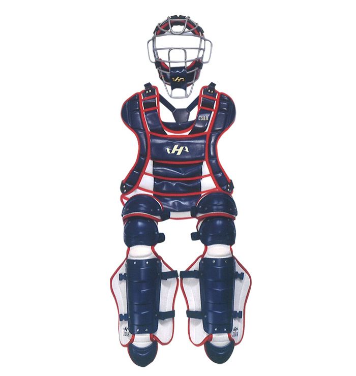 ハタケヤマ(HATAKEYAMA) 少年軟式用 キャッチャー防具3点セット 品番:CG-JN23ND カラー:ネイビー×ホワイト×レッド セット内容:マスク、プロテクター、レガース 付属品:専用袋 (財)全日本軟式野球連盟公認 SGマーク合格品 原産国:日本