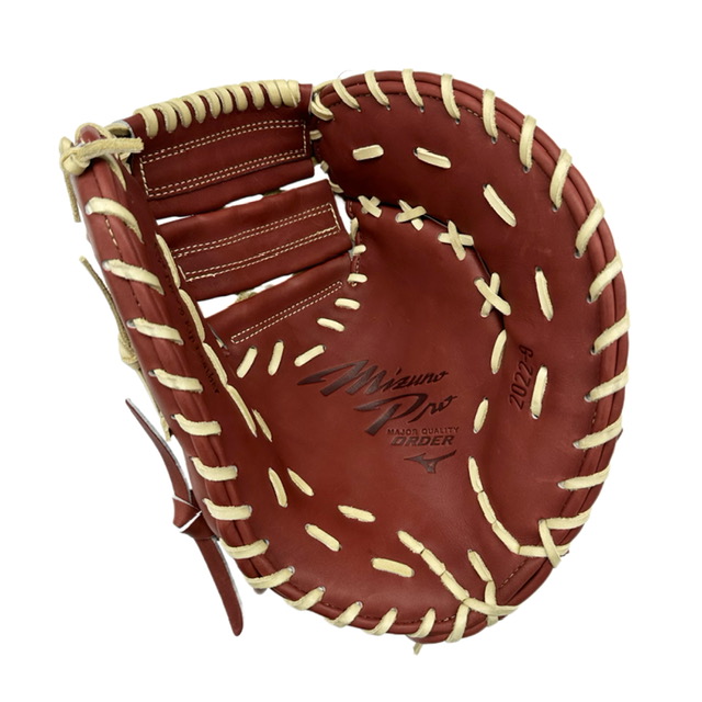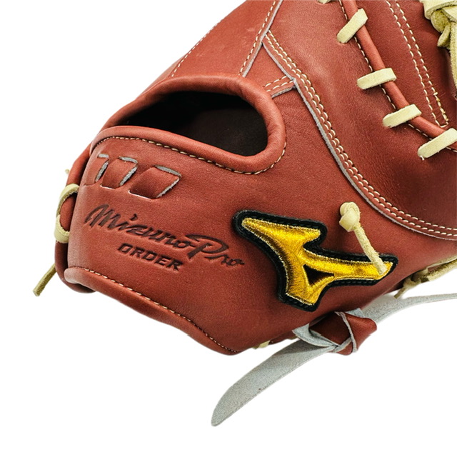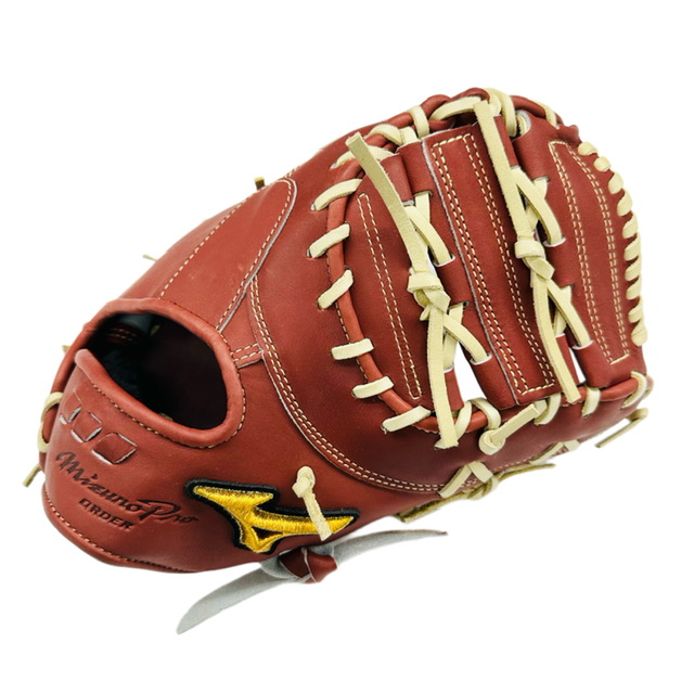ミズノ(MIZUNO) BSSショップ限定 ミズノプロ 硬式ファーストミット スポコバオリジナル 品番:1AJFH88250 カラー:ローズブラウン(66) 素材:プレキシーキップレザー(天然皮革:牛革) サイズ:(基本モデルズバリ) バックスタイル:ノーマルスタイル:5DNA 裏革カラー:プラムブラウン(68) ステッチカラー:シャンパンゴールド(11) 革紐カラー:ブロンド(80) ベロ裏カラー:(ブラック) ベロ裏:内蔵型ハイブリッドムートン 芯スタイル:ワイドヨコトジダブル 指当て:あり モデル:山川穂高(埼玉西武)モデル ポジション:一塁手用 左右:右投用 付属品:専用袋付き 原産国:日本製