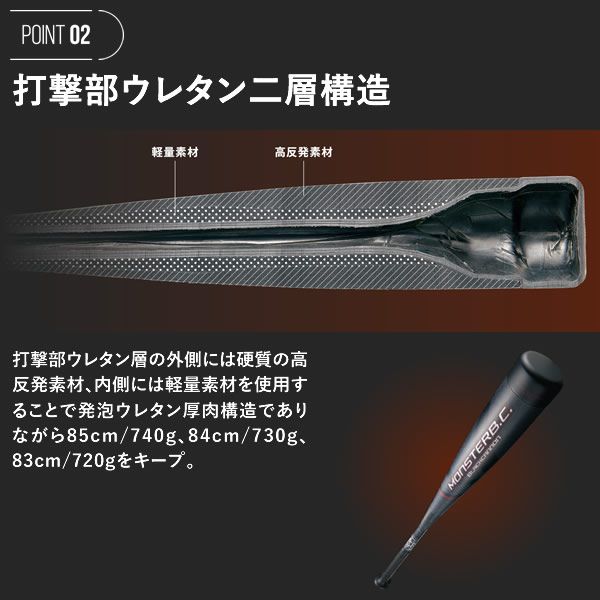 ゼット(ZETT) 一般軟式用FRP製バット M号ボール対応 モンスターブラックキャノン 品番:BCT313 カラー:ブラック(1900) サイズ 83cm/720g平均(BCT31383) 84cm/730g平均(BCT31384) 85cm/740g平均(BCT31385) 直径:φ69.5mm バランス:ミドルバランス 素材:FRP(カーボン)+打撃部発泡ウレタン グリップテープ:BTX1280 付属品:専用バットケース 生産国:日本