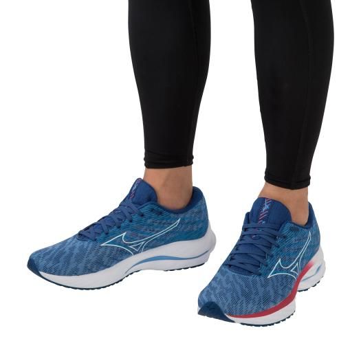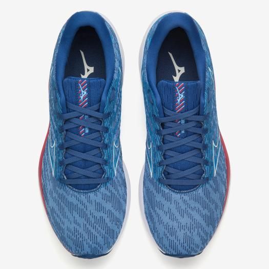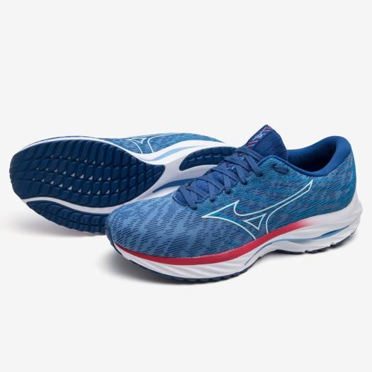 ミズノ(MIZUNO) ランニングシューズ ウエーブライダー26 品番:J1GC220355 カラー:55:ブルー×グレー×レッド サイズ:25.0~29.0cm 素材 甲材:合成繊維×人工皮革 底材:合成底 質量:約285g(27.0cm片方) インソール:プレミアムインソール(取り外し可) シューズ幅:2E相当の方向け 原産国:ベトナム製