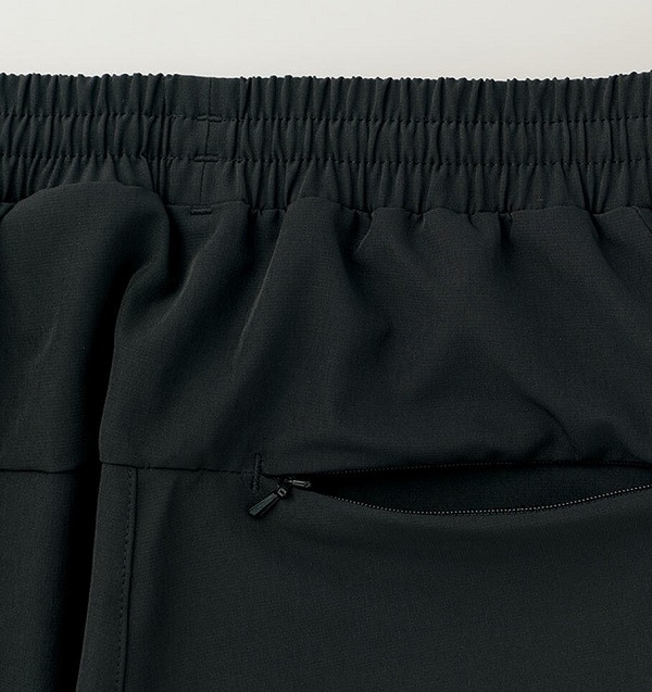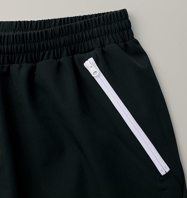 ジャケットとセットップ可能。ポケット部分にアクセントで配色した止水ファスナーを使用。股部分はストレッチ素材をバイアスカットしてストレッチ性能をアップ。