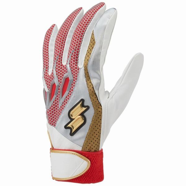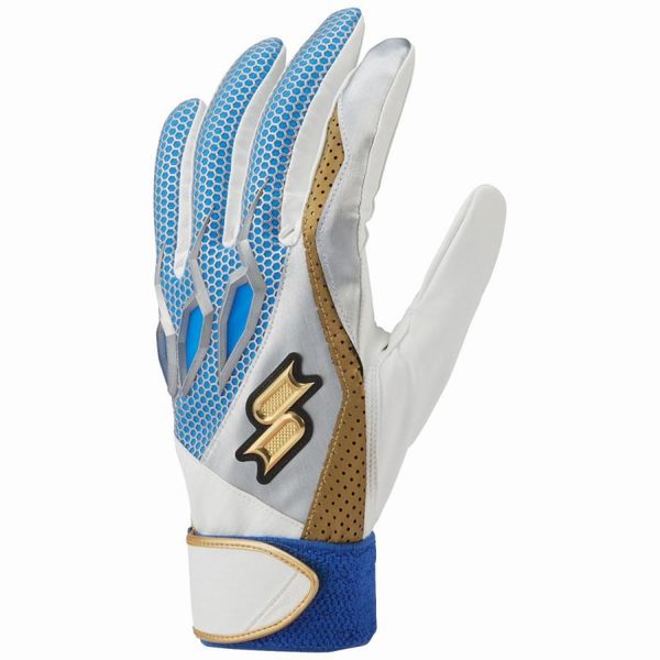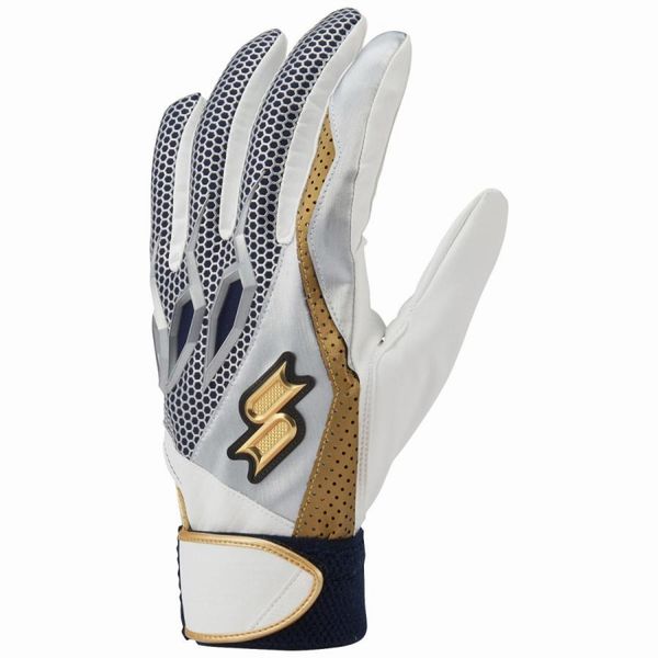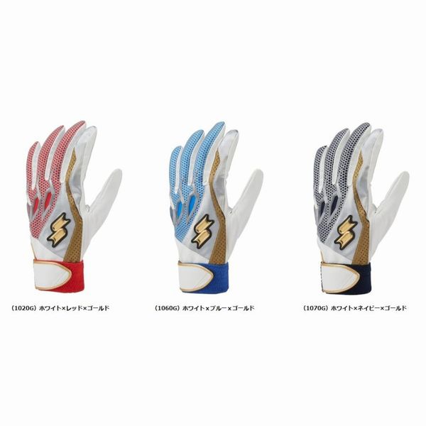 エスエスケイ(SSK) プロエッジ バッティング手袋 両手用 品番:EBG5000W カラー (1020G)ホワイト×レッド×ゴールド (1060G)ホワイトxブルーxゴールド (1070G)ホワイト×ネイビー×ゴールド サイズ:S(22-23cm)、M(24-25cm)、L(26-27cm) 素材:合成皮革×合成繊維 機能・特徴 水洗い可能