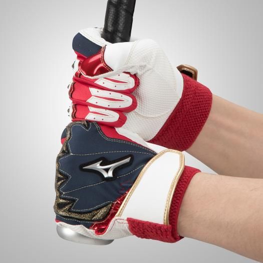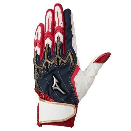 ミズノ(MIZUNO) 手袋 両手用 シリコンパワーアークLI レプリカ 勝色コレクション 品番:1EJEA51529 カラー:29:ネイビー×レッド×ゴールド サイズ:S(22~23cm)、M(24~25cm)、L(26~27cm) 素材 平側素材:合成皮革 甲側素材:合成皮革、合成繊維 機能・特徴 勝色コレクション限定『ゴールドラメ入りシリコーン』採用 シリコンパワーアークライン(限定ラメ入りシリコーン) パワーアーク専用ワイドロングベルト(手首ベルト部) ダイヤエンボス合成皮革(掌部) 単独水洗い可能モデル 原産国:ベトナム製、フィリピン製