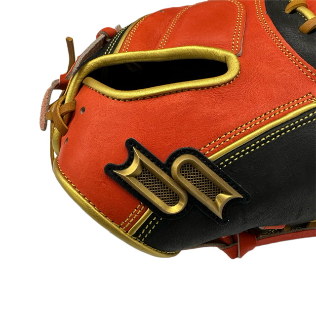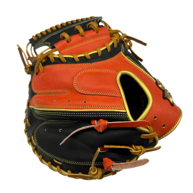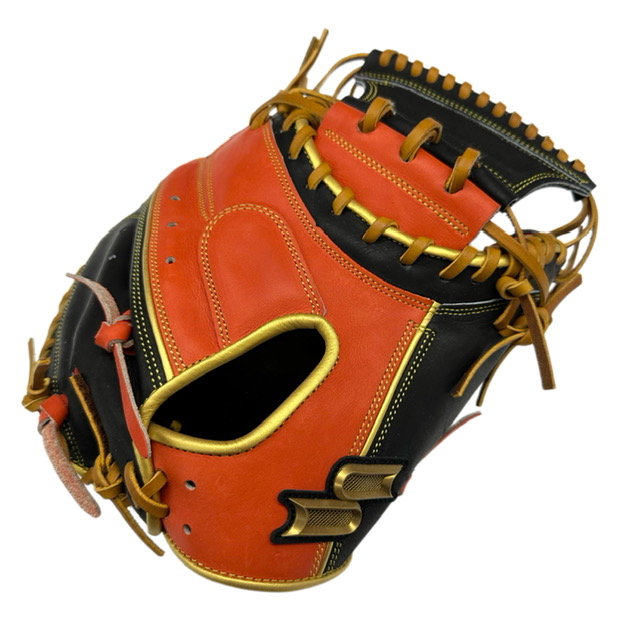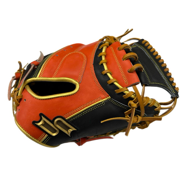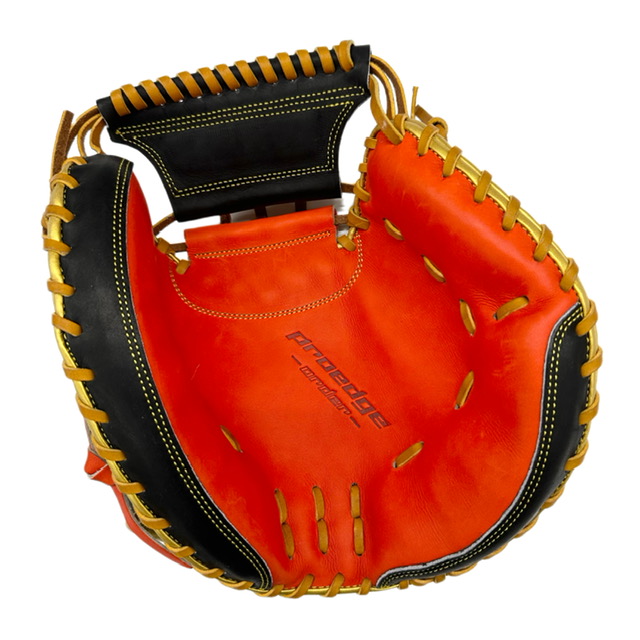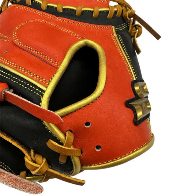 エスエスケイ(SSK) プロエッジ 軟式 オーダーキャッチャーミット スポコバオリジナル 阪神タイガース 梅野 隆太郎モデル 品番:PEOM044GN20 カラー 本体:レディッシュオレンジ×ブラック 平裏:ブラック ヘリ革:ゴールド ステッチ:金茶 バンド裏ムートン:ブラック 紐革:タン モデル:044型 ウェブ:基本ウェブ バックスタイル:フリーフレクション ロゴマーク:ブロンズゴールド ファンクション:U-LOOP パッド芯:硬め 指カバー(指当て):指当て ポジション:捕手用 左右:右投用 付属品:専用グラブ袋付き 原産国:中国