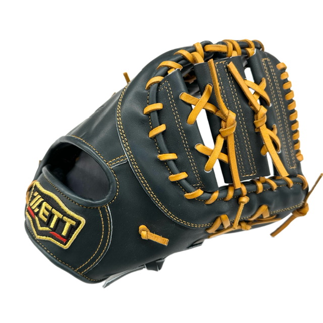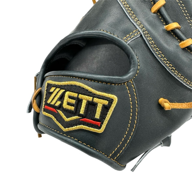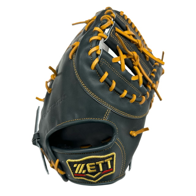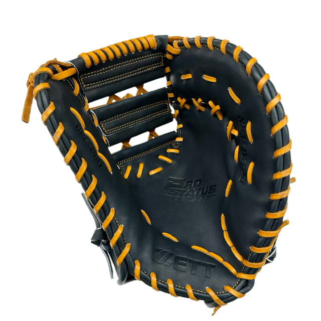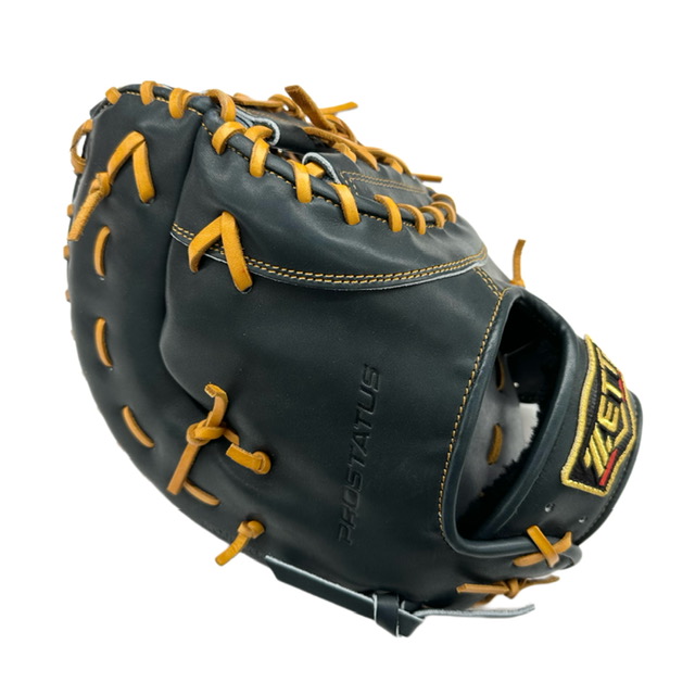 ゼット(ZETT) プロステイタス 硬式用オーダーグラブ スポコバオリジナル ファーストミット 113型 品番:BPFPRO カラー 本体:ナイトブラック ヘリ革:ナイトブラック 平裏:ダークグレー 縫い糸:ライトゴールド バンド裏ムートン:ブラック 紐革:オークブラウン(芯通し) 素材:プロステイタスレザー 手口紐通逆巻き ポジション:一塁手用 モデル:113型 左右:右投用 ウェブ:ファーストミット用ウェブ バックスタイル:ファースト用 付属品:専用袋付き 原産国:日本製