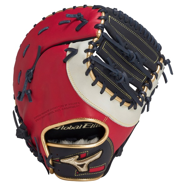 ミズノ(MIZUNO) グローバルエリート 軟式グラブ グローバルエリート インフィニティNEO 品番:1AJFR28300 カラー:2962(Dブルー×レッド) 素材:クレストハイドシュアエリートR(天然皮革:牛革) 左右:右投用 型説明:TK型 ポジション:一塁手用(キャッチングエリアが広いボックス仕立てで、しっかりとした捕球ができるオーソドックスなモデル) 付属品:専用袋付(中国製) 原産国:フィリピン