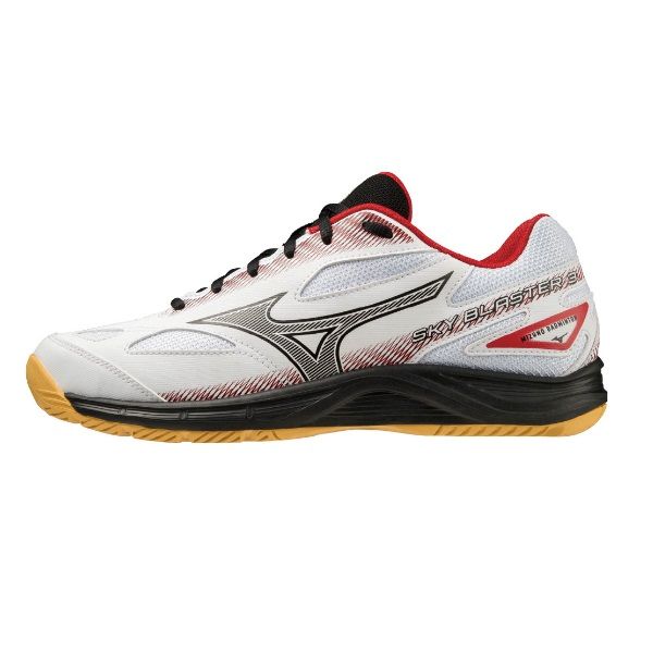 ミズノ(MIZUNO) バドミントンシューズ スカイブラスター3 品番:71GA234501 カラー:01:ホワイト×ブラック×レッド サイズ:19.0、20.0、21.0、22.0~28.5cm 素材 甲材:人工皮革×合成繊維 底材:合成底 シューズ幅:3E相当 質量:約275g(27.0cm片方) インソール:カップインソール、取り外し可 ソール特徴:ノンマーキングソール 生産国:ベトナム製