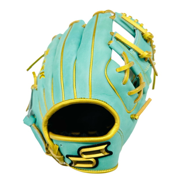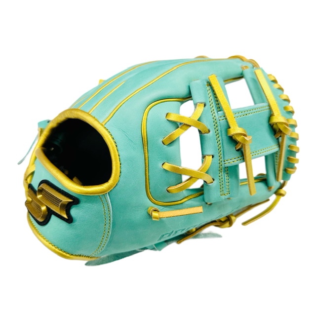品番:PENSC123 カラー:5238(Mグリーン×ゴールド) 素材:天然皮革(ステアレザー) 左右:右投げ ポジション:内野手用 レングス:5L ウェブ:ニューショート 付属品:グラブ袋
