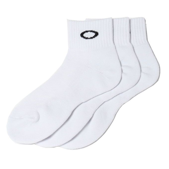 オークリー(OAKLEY) ソックス3足組 品番:93238JP カラー:ARCTIC WHITE(10R) サイズ:23.0~25.0cm、25.0~27.0cm、27.0~29.0cm 素材:ポリエステル61%/コットン28%/ポリウレタン11% 機能・特徴 足のバネとしての機能を果たす土踏まずアーチの形状を保持し、運動中のパフォーマンスをサポート。 メッシュ状の編み込みで通気性を持たせることで、足の蒸れを軽減。補強されたつま先、かかと部分。
