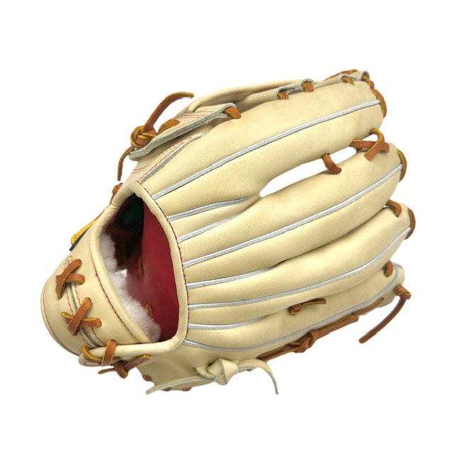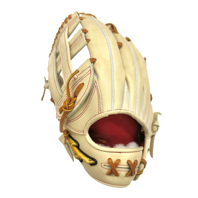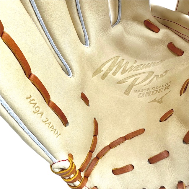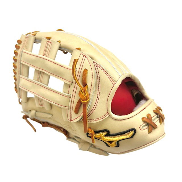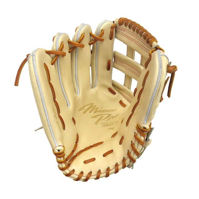 ミズノ(MIZUNO) BSSショップ限定 ミズノプロ 硬式グラブ スポコバオリジナル 品番:1AJGH88250 カラー:ブロンド(80H) 素材:プレキシーキップレザー(天然皮革:牛革) 裏革カラー:レッド(62) サイズ:18N(10mm小) ウェブ:クロス6 バックスタイル:ノーマルスタイル:AXI ステッチカラー:赤(5) 革紐カラー:シナモンコルク(591) ロゴ:ゴールド モデル:AXIモデル ポジション:外野手用 左右:左投用 付属品:専用袋付き 原産国:日本製