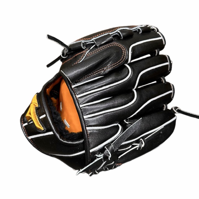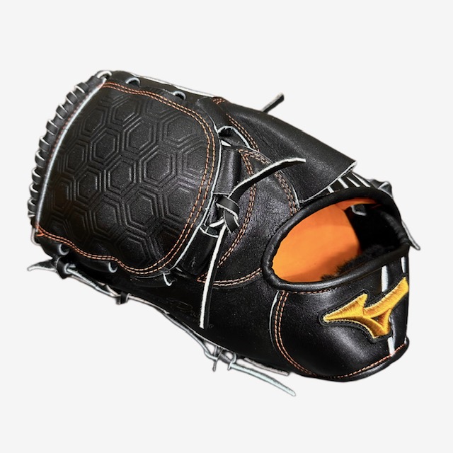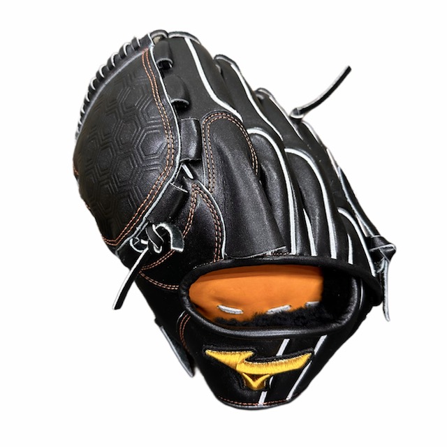 ミズノ(MIZUNO) BSSショップ限定 ミズノプロ 硬式グラブ スポコバオリジナル 品番:1AJGH70350 カラー:Mブラック(M09) 素材:プレキシーエリート(天然皮革:牛革) 裏革カラー:ビターオレンジ(542) サイズ:13(基本モデルズバリ) ウェブ:タータンKM6 バックスタイル:KMフロウスタイル ステッチカラー:オレンジ(7) 革紐カラー:ブラック(1) ロゴ:ゴールド モデル:前田健太モデル ポジション:投手用 左右:左投用 付属品:専用袋付き 原産国:日本製