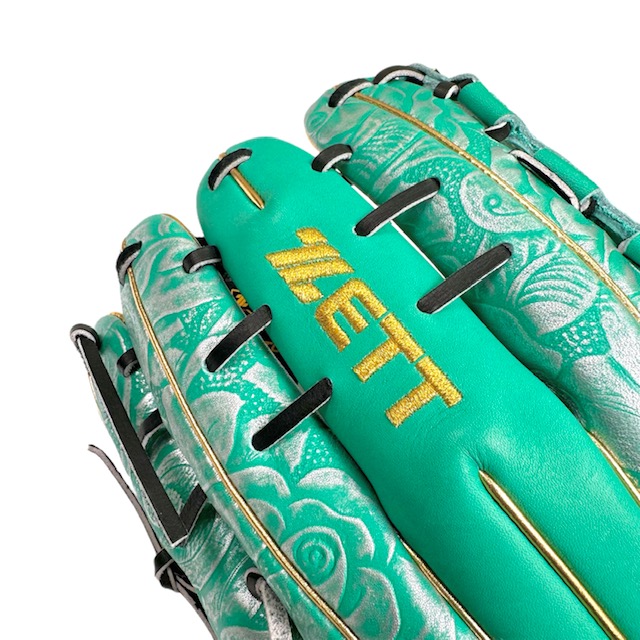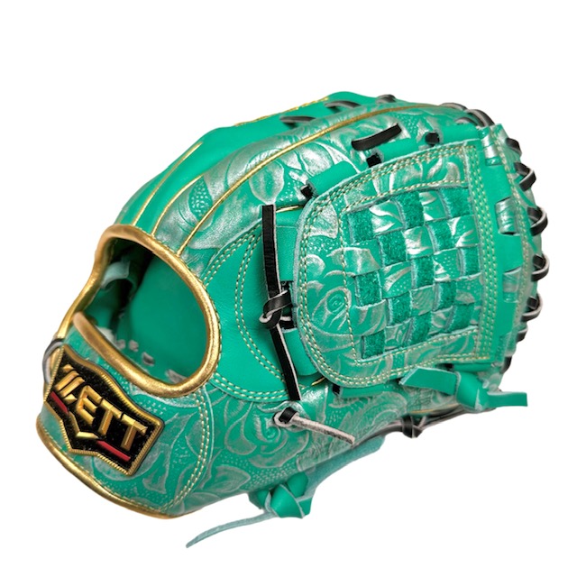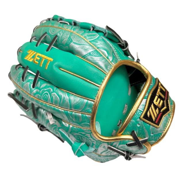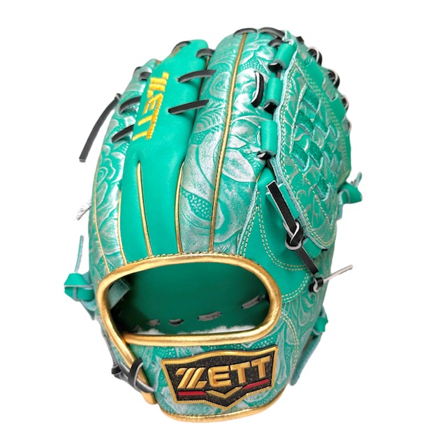 捕球面の張りとしっかり感にこだわったプロステイタスシリーズの限定品。 エメラルドグリーン革にシルバー型押し加工を施したツートン配色にスターラメウェルダーラベル仕様モデル。 通常使用でも小指二本入れで使用しても操作性が高いコンパクトで深めなポケット設計の源田タイプ。