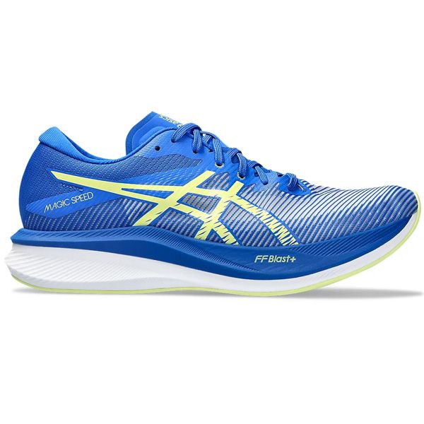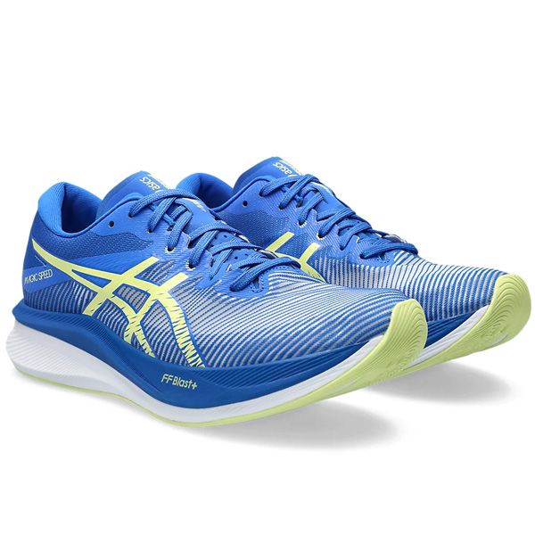 アシックス(asics) ランニングシューズ マジックスピード3 品番:1011B703 カラー:ILLUSION BLUE/GLOW YELLOW(400) サイズ:24.5~29.0cm 素材 アッパー:合成繊維・合成樹脂 アウトソール:ゴム底 インナーソール:合成樹脂(EVA)/固定式 足幅:STANDARD 機能・特徴 MAGIC SPEEDシリーズが、前作よりもやわらかく、反発性も向上してアップデート。 フルレングスのカーボンプレートが、着地から蹴り出しにかけて足の動きを安定させつつ、効果的に身体を前方方向へ推進させる効果を発揮します。 ミッドソールには上層部・下層部ともにFF BLAST PLUSを採用することで、クッション性・反発性が向上し、より弾むような走り心地を提供。 アウターソールかかと部ラバーの接地面積を広げることで安定性の向上も実現しました。 生産国:ベトナム