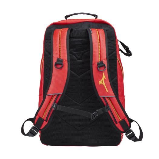 ミズノ(MIZUNO) ミズノプロ バックパック 40L 品番:1FJD3000 カラー:62:レッド 素材:合成皮革(PVC) サイズ:L34×W21×H54cm 質量:約1600g 容量:約40L 機能・特徴 ・サイドのフックで防具、ヘルメットなど取付可能 ・両サイドポケット付きファブリーズも入るサイズ ・選手の安全に配慮した再帰反射パイピング ・底部も合成皮革で水が染み込みにくい設計 原産国:中国製