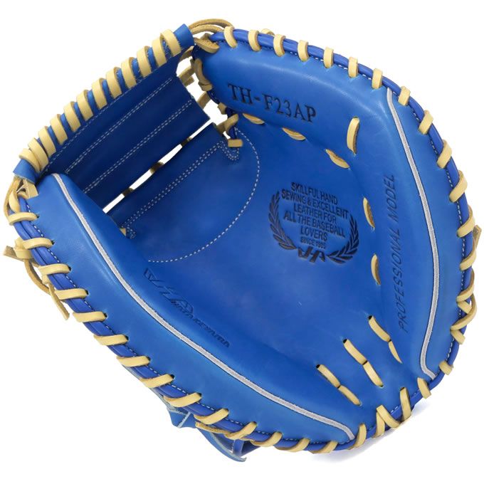 ハタケヤマ(HATAKEYAMA) 軟式野球 キャッチャーミット 品番:TH-F23AP カラー:ブルー 左右:右投用 素材 表革:北米ステアハイド 裏革:共牛革 基本モデル:M23型 ポジション:捕手用 機能・特徴 Uバック ピンキーパターン 座ブトンスポンジ 原産国:台湾