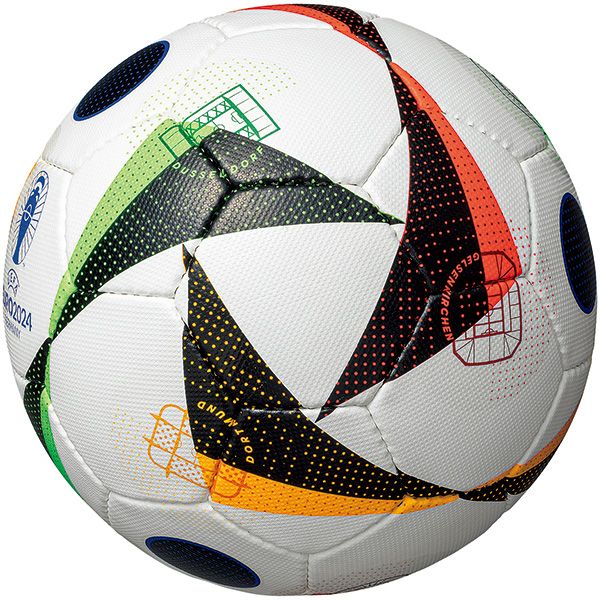 フースバルリーベはドイツ語で「フットボールへの愛」を意味します。 フットボールの喜びと大会トーナメントのエネルギーよりインスピレーションを得て、色鮮やかなエッジ、曲線、ドット表現にて強調された目立つ黒い翼形状を通じて、ボール自体の動きや試合でのエネルギーを表現しています。 また、力強い赤、青、緑、オレンジカラーの使用は、対戦国が大会トーナメントにもたらす活気と、世界中のファンから多くの愛を引き込むフットボールの純粋な純真さの双方を称賛しています。 試合球には大会トーナメントで使用される各スタジアムが開催都市の名前と共に表現されています。
