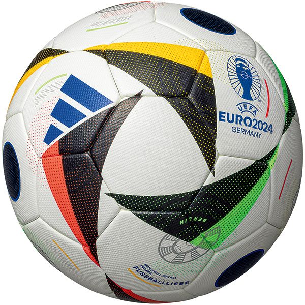 フースバルリーベはドイツ語で「フットボールへの愛」を意味します。 フットボールの喜びと大会トーナメントのエネルギーよりインスピレーションを得て、色鮮やかなエッジ、曲線、ドット表現にて強調された目立つ黒い翼形状を通じて、ボール自体の動きや試合でのエネルギーを表現しています。 また、力強い赤、青、緑、オレンジカラーの使用は、対戦国が大会トーナメントにもたらす活気と、世界中のファンから多くの愛を引き込むフットボールの純粋な純真さの双方を称賛しています。 試合球には大会トーナメントで使用される各スタジアムが開催都市の名前と共に表現されています。