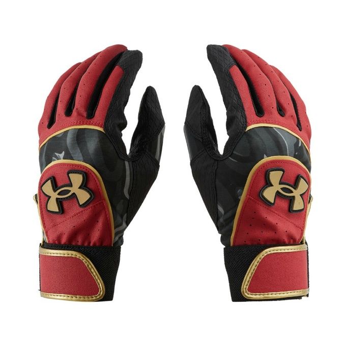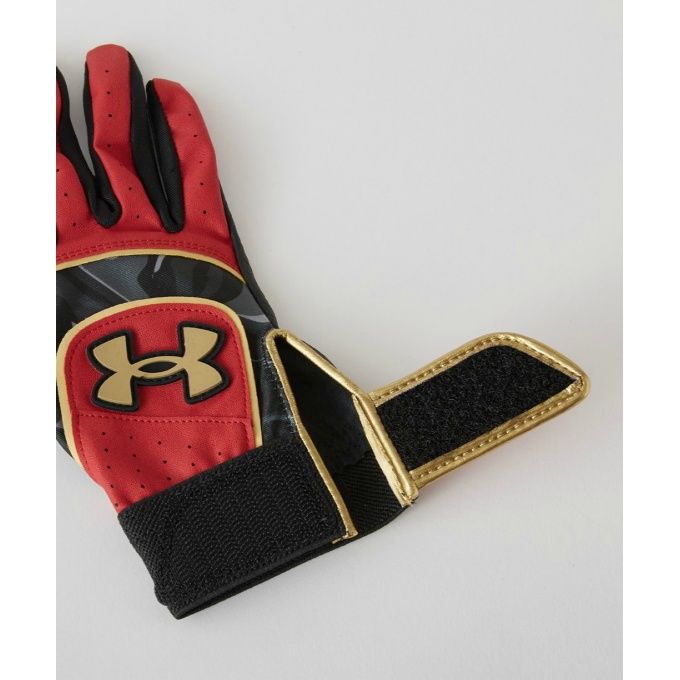アンダーアーマー(UNDER ARMOUR) ジュニア バッティンググローブ 両手用 UA スターター 品番:1371990 カラー:RED/GLD(602) サイズ:YSM(16~17cm)、YMD(18~19cm)、YLG(20~21cm)、YXL(22~23cm) 素材:合成皮革、ポリエステル、ポリウレタン 機能・特徴 立体成型:手の構造に沿ったカッティングが、グリップ時のフィット感を高める ウォッシャブル対応:グリップ力を高めるダイヤモンド型のエンボスレザーを使用 原産国:インドネシア