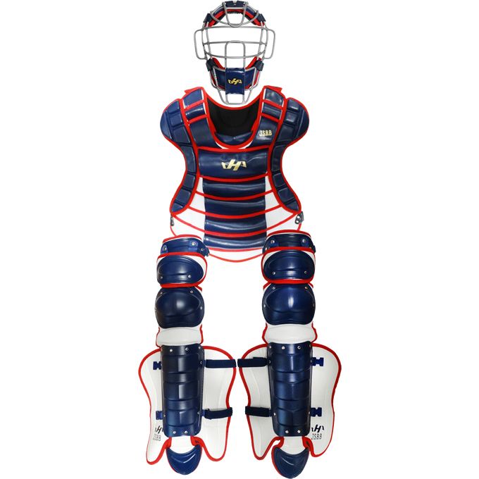 ハタケヤマ(HATAKEYAMA) 一般軟式用 キャッチャー防具3点セット 品番:CG-N24ND カラー:ネイビー×ホワイト×レッド セット内容:マスク、プロテクター、レガース 付属品:専用袋 (財)全日本軟式野球連盟公認 SGマーク合格品 原産国:日本